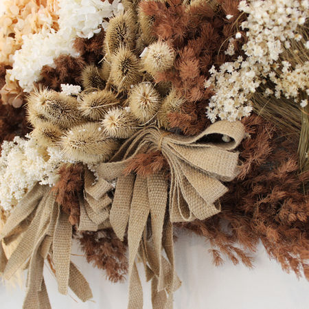 Solution: Crafted a low maintenance, minimalist yet tactile installation using preserved woven thistles, ming ferns, hydrangeas, and pleated hessian ribbons in a palette drawn from desert and sea landscapes.